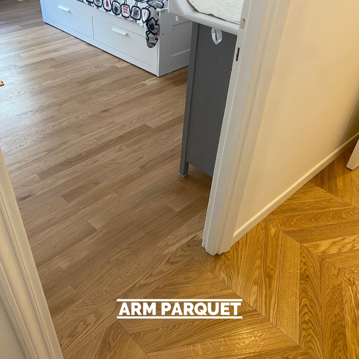 Sono arrivato con le idee chiare su ciò che volevano, un Parquet a Spina Ungherese(60°). Dopo aver visto diverse essenze e diverse finiture hanno scelto il Rovere Spazzolato e Verniciato naturale.