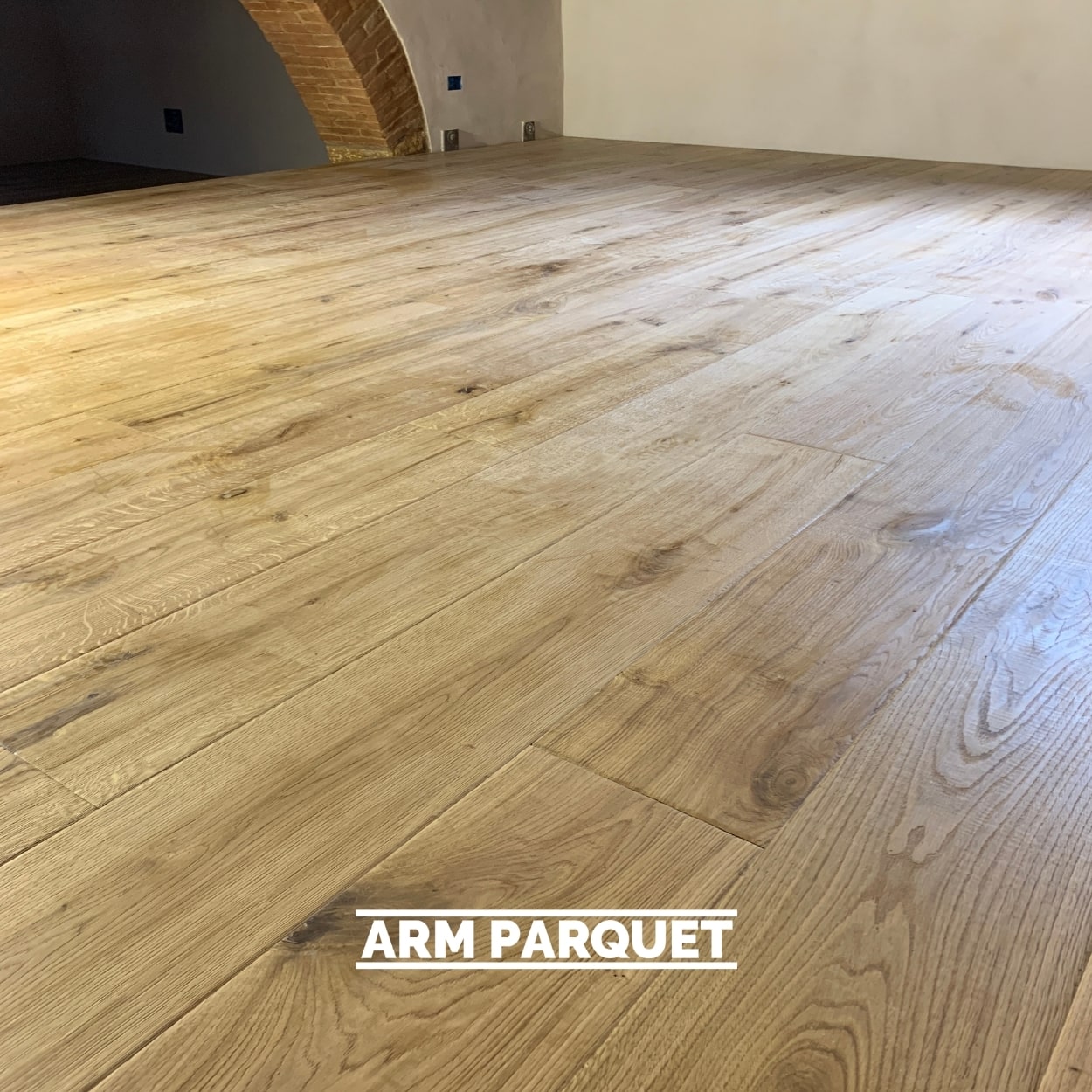 Il parquet in oggetto è una Maxi Plancia di Rovere prefinito in scelta Rustica. Ha una larghezza di 240mm, una superficie Spazzolata e Piallata con una finitura ad acqua naturale.